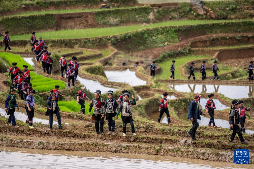 5月2日,在云南省紅河縣甲寅村“開秧門”儀式上,村民身著民族服飾,沿著田埂踏歌而行。新華社記者 胡超 攝