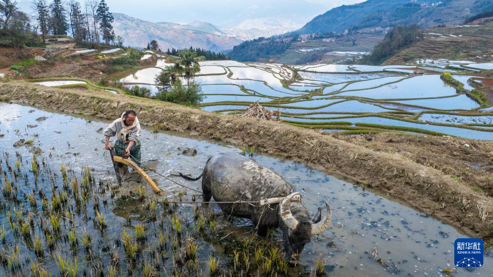 2月26日,在云南省元陽縣阿者科村,村民在驅牛犁田(無人機照片)。新華社記者 胡超 攝