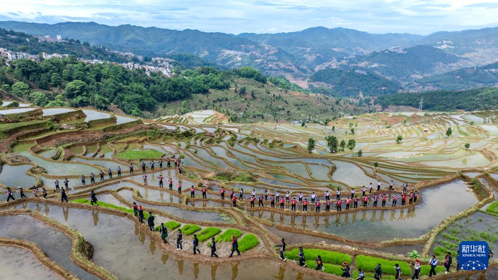 5月2日,在云南省紅河縣甲寅村“開秧門”儀式上,村民身著民族服飾,沿著田埂踏歌而行(無人機照片)。新華社記者 胡超 攝