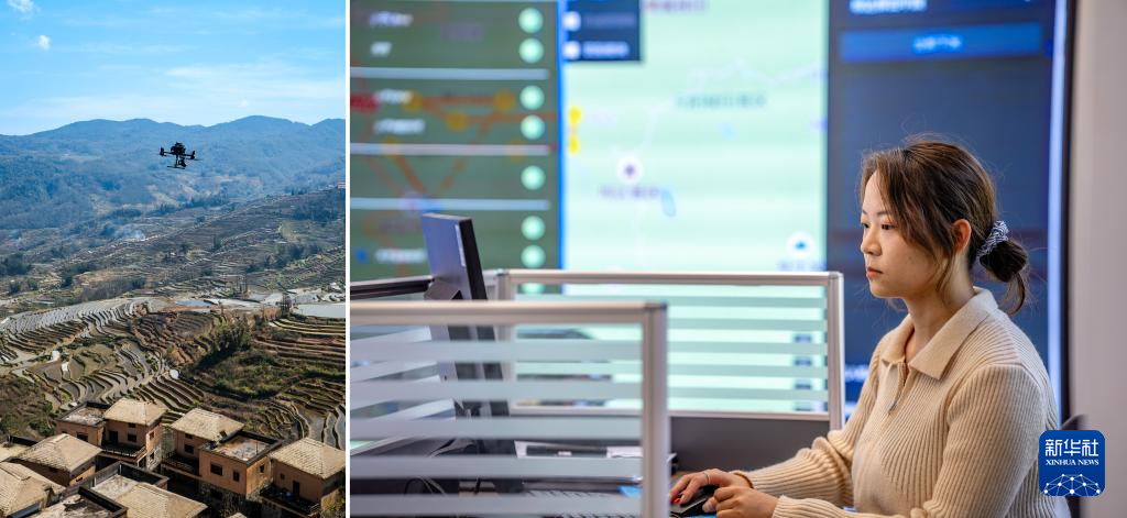這是一張拼版照片。左圖:2月28日,云南省元陽縣哈尼小鎮的無人機在執行巡視任務(無人機照片);右圖:2月28日,紅河哈尼梯田世界文化遺產管理局的工作人員陳星宇在控制無人機集群操作系統執行巡視任務。新華社記者 胡超 攝