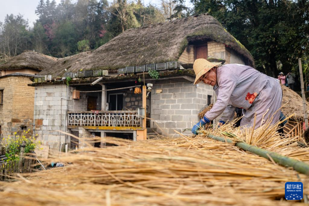 2月26日,在云南省元陽縣阿者科村,村民在修繕“蘑菇房”茅草頂。新華社記者 胡超 攝