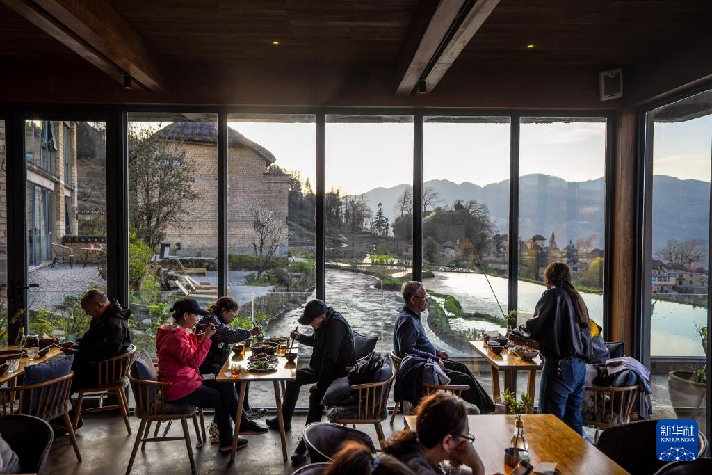 2月27日,在云南省元陽縣阿者科村,游客在村民開的民宿餐廳吃晚餐。新華社記者 胡超 攝