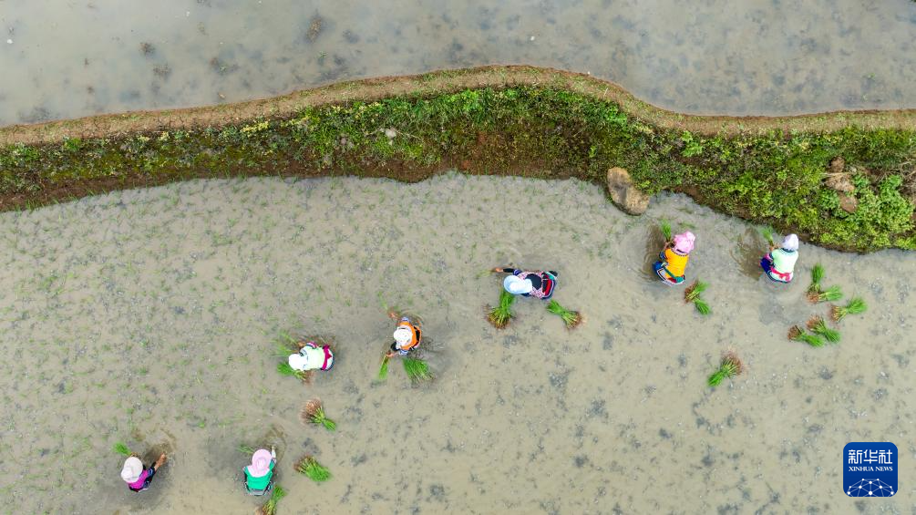 5月2日,在云南省紅河縣甲寅村,村民在梯田里插秧(無人機照片)。新華社記者 胡超 攝