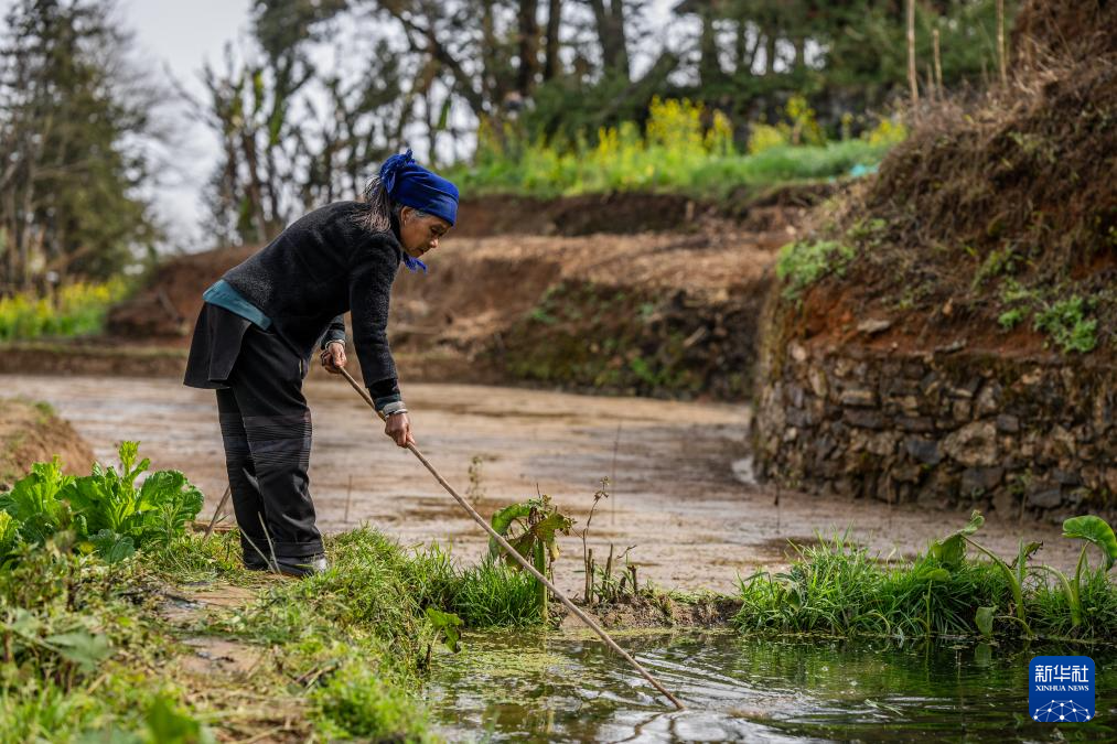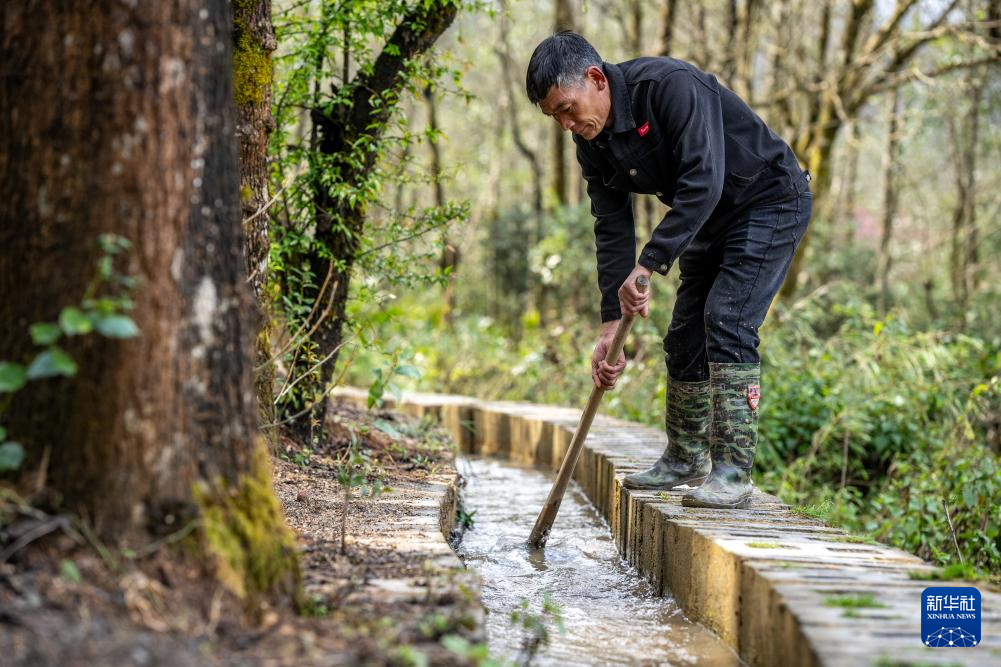 2月26日,在云南省元陽縣阿者科村,“趕溝人”高有明在清理水渠中的樹葉和垃圾,維系梯田的水源暢通。新華社記者 胡超 攝