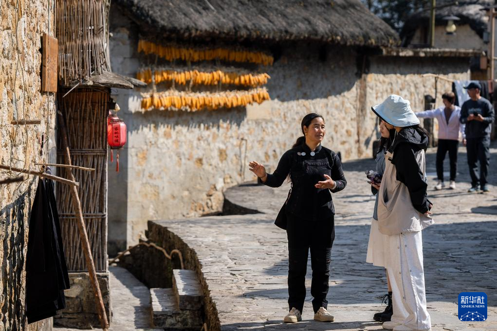 2月28,在云南省元陽縣阿者科村,村民導游高美華(左)在為游客講解。新華社記者 胡超 攝