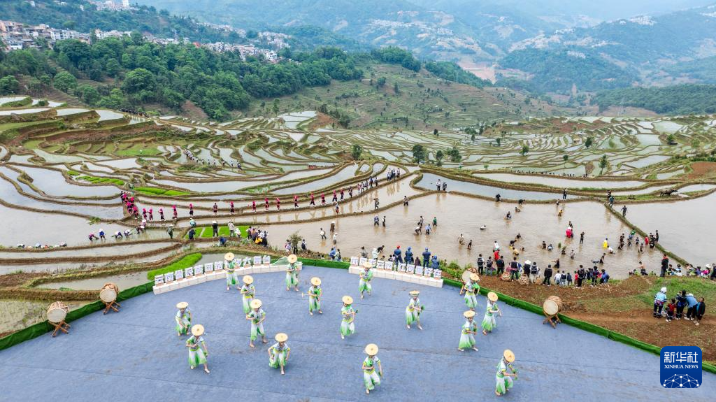5月2日,在云南省紅河縣“開秧門”活動現場,演員以梯田為背景表演(無人機照片)。新華社記者 胡超 攝