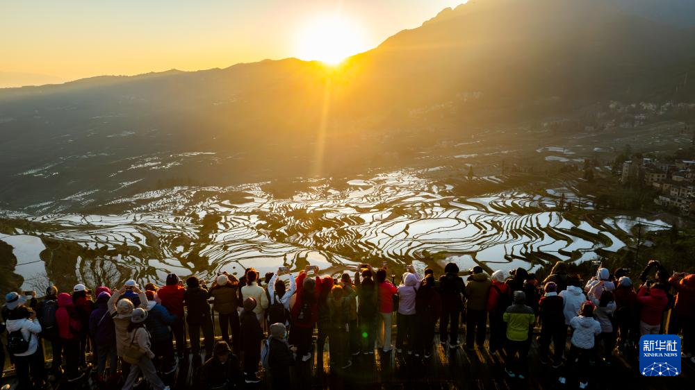 2月28日,在云南省元陽縣阿者科村,游客在梯田拍照留影。新華社記者 王安浩維 攝