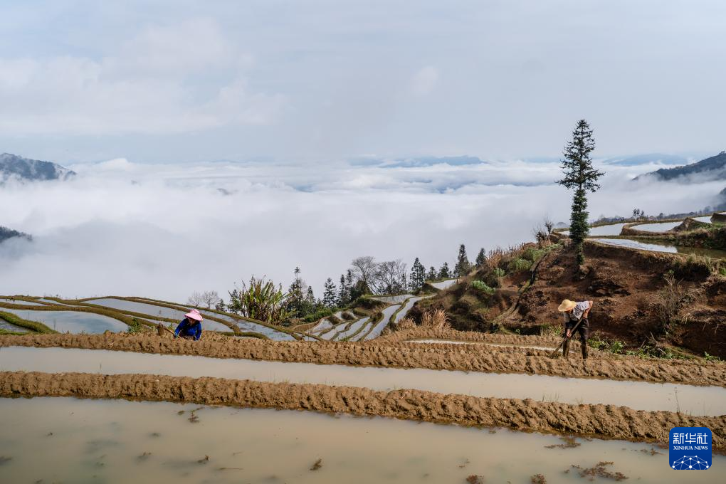 2月26日,村民在云南省元陽縣阿者科村修筑田埂。新華社記者 王安浩維 攝