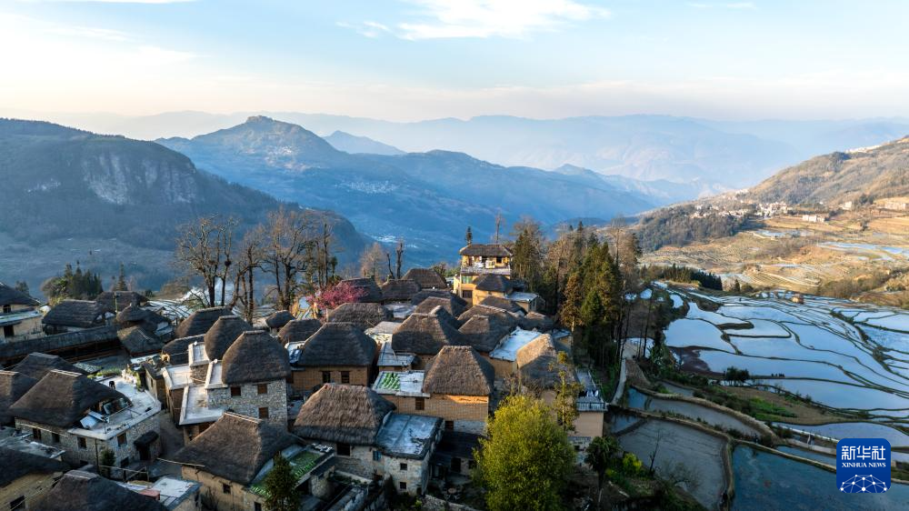 這是2月27日在云南省元陽縣阿者科村拍攝的傳統民居“蘑菇房”和梯田(無人機照片)。新華社記者 胡超 攝