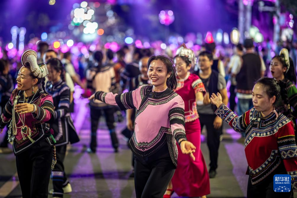 5月1日,在云南省紅河縣蓮花大道,游客和當地群眾在參加萬人樂作舞會。新華社記者 胡超 攝