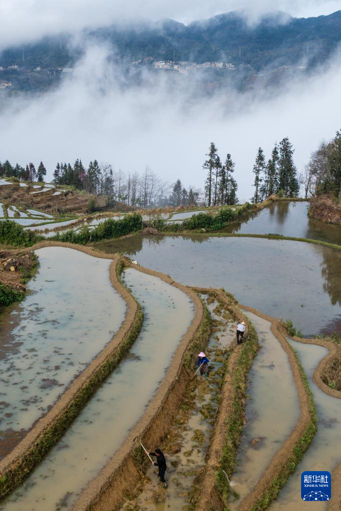 2月26日,村民在云南省元陽縣阿者科村修筑田?。o人機照片)。新華社記者 胡超 攝
