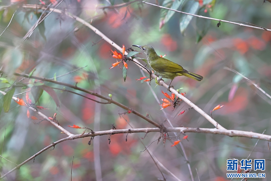 純色啄花鳥在樹枝上覓食(5月12日攝)。新華網發(楊學飛 攝)
