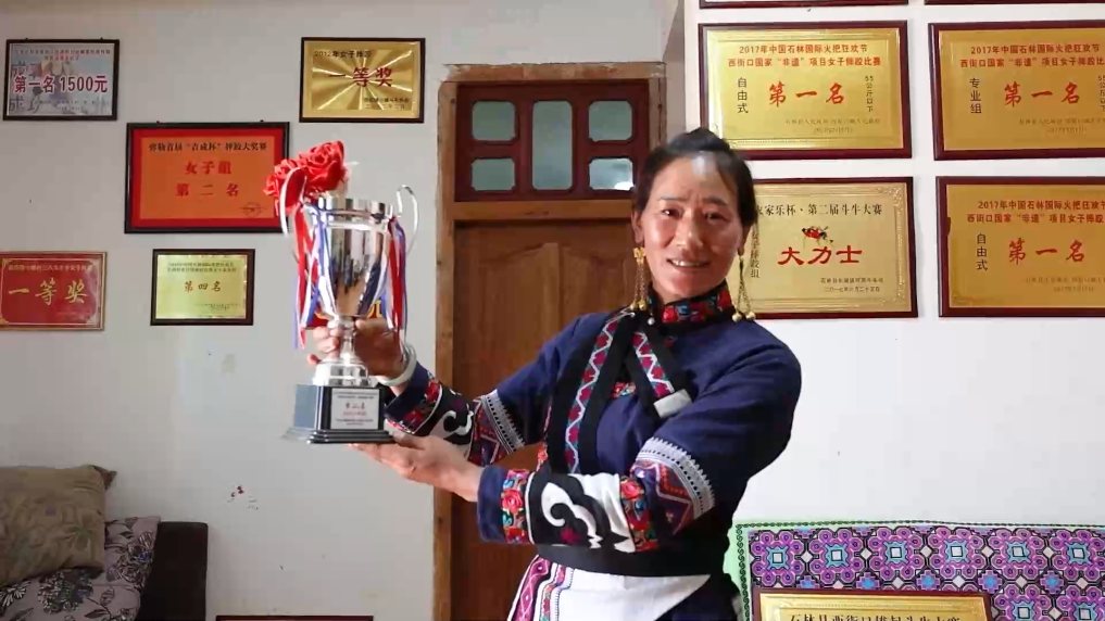 “冠軍”“大力士”“第一名”……三十余年來,在云南省石林、師宗、陸良、瀘西、彌勒等市縣的摔跤場上,一位名叫昂玉蘭的阿詩瑪拿下了一百多個獎項。她是國家級非物質文化遺產代表性項目彝族摔跤縣級代表性傳承人,她的家里放滿了金晃晃的獎牌。