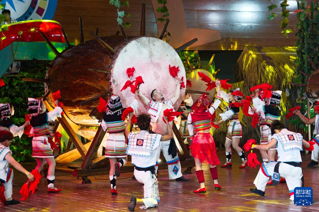 5月16日,演員在基諾山寨景區表演基諾大鼓舞。2006年,基諾大鼓舞被列入第一批國家級非物質文化遺產名錄。