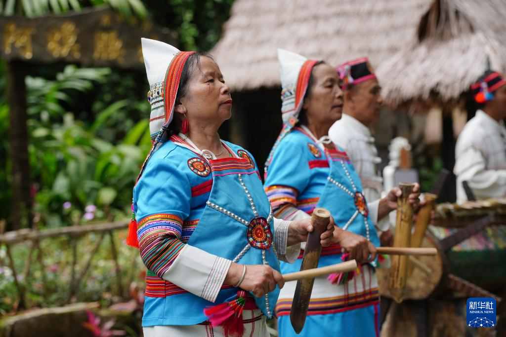 5月16日,演員在基諾山寨景區表演基諾族民間音樂“奇科阿咪”。