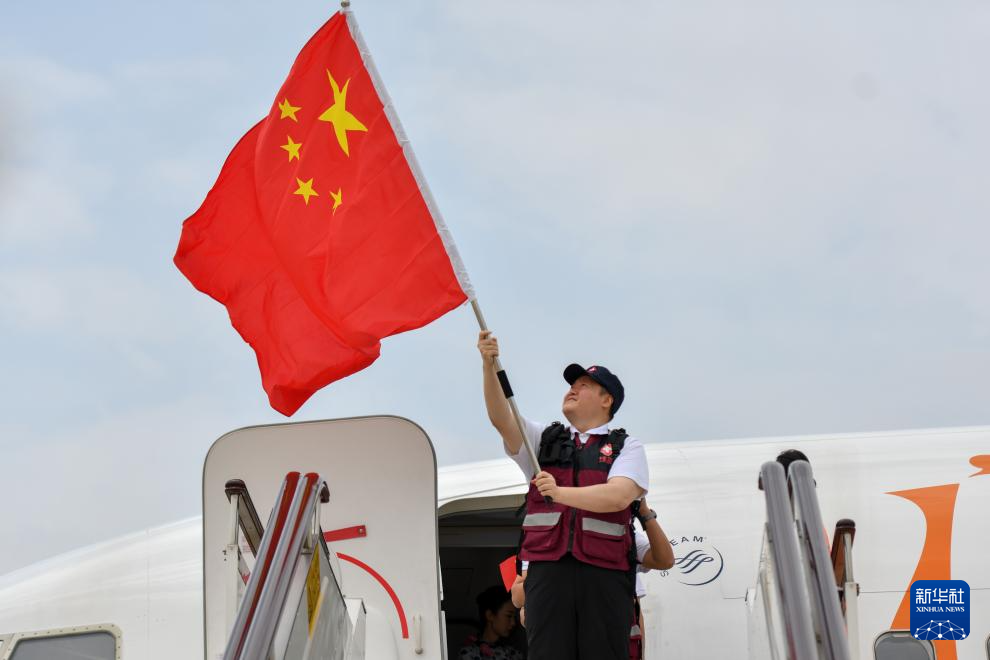 5月18日,中國政府援緬衛生防疫隊隊員抵達昆明長水國際機場后,在艙門前揮舞國旗。新華社發(彭奕凱 攝)