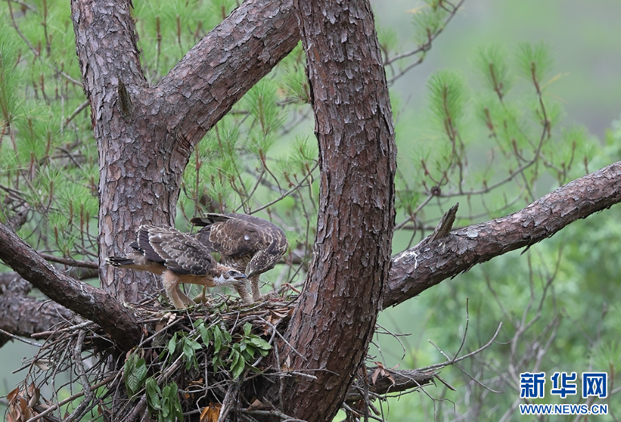 鳳頭鷹雕“鳥媽”把食物撕碎喂給雛鳥(5月19日攝)。新華網發(楊學飛 攝)