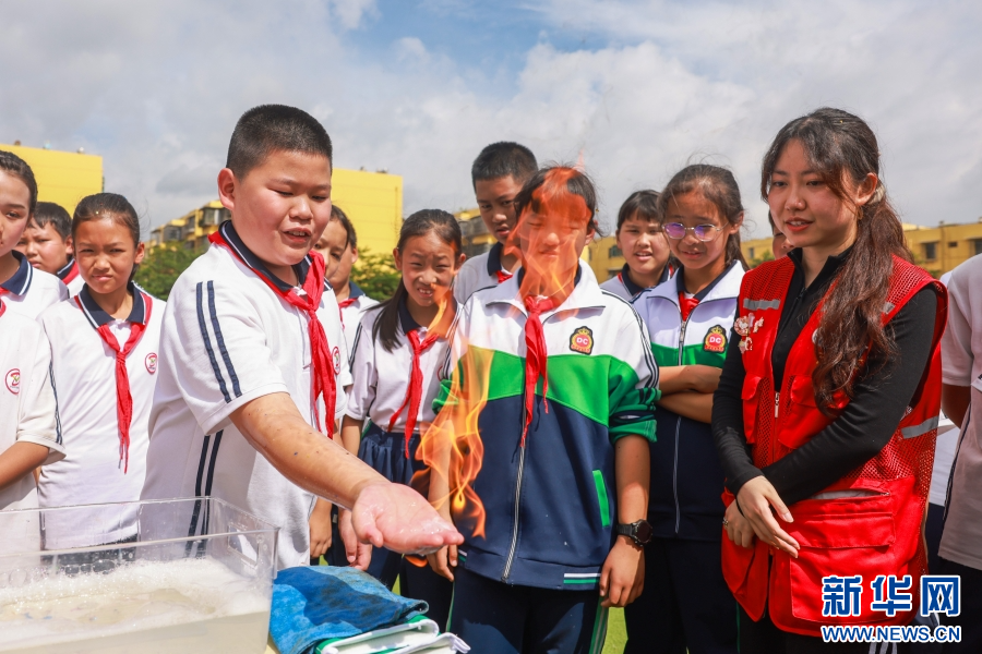在云南省開遠市東城小學“六一玩轉科技 童心趣闖未來”主題活動中,五年級學生體驗“火焰掌”丁烷肥皂氣泡在手中燃燒(5月30日攝)。新華網發(陶家淇 攝)