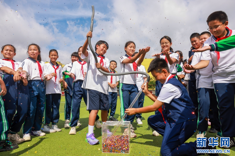 在云南省開遠市東城小學“六一玩轉科技 童心趣闖未來”主題活動中,五年級學生們利用流體力學灑落箱子里的彩屑(5月30日攝)。新華網發(陶家淇 攝)