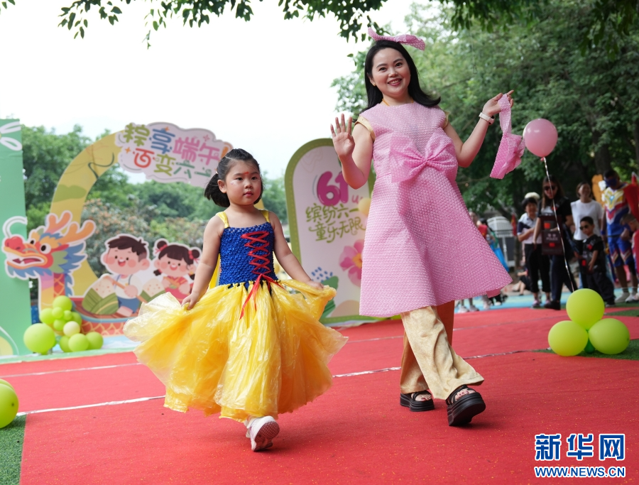 云南省水富市一幼兒園舉辦親子環保時裝秀迎“六一”(5月29日攝)。新華網發(狄廷秀 攝)