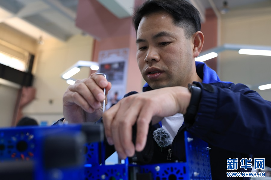 劉旺才研究機器人零件(3月7日攝)。