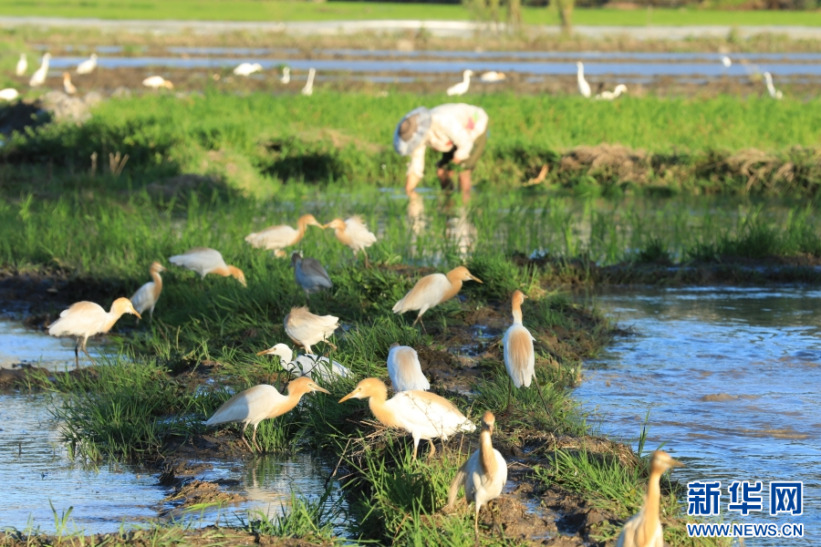 云南省騰沖市和順鎮,白鷺與農人相伴(6月15日攝)。新華網發 (龔祖金 攝)
