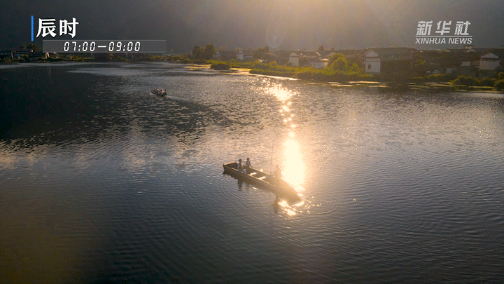 辰時(07:00-09:00),曙光初照,湖面波光粼粼。村民們劃著小木船,開始了一天的勞作。