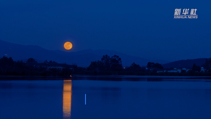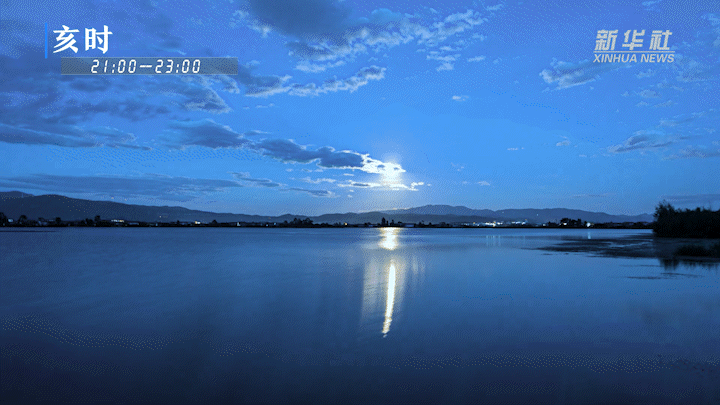 戌時(19:00-21:00),夜幕降臨,圓月升起,月光灑在湖面,粼粼清輝里浮動著萬千銀鱗。