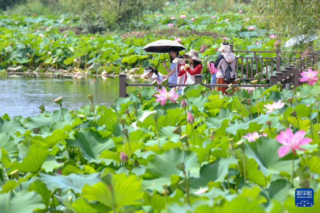 7月16日,游客在普者黑景區游玩拍照。新華社發(彭奕凱攝)