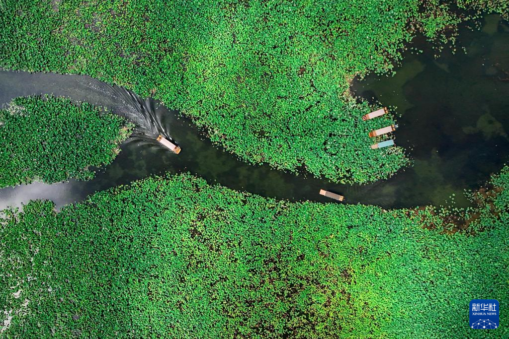 7月15日,游客在普者黑景區內乘船游覽(無人機照片)。新華社發(彭奕凱攝)