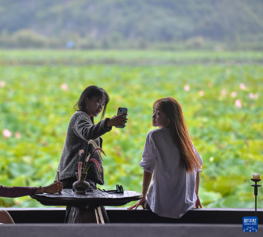 7月15日,游客在普者黑景區內的一家咖啡館拍照打卡。新華社發(彭奕凱攝)