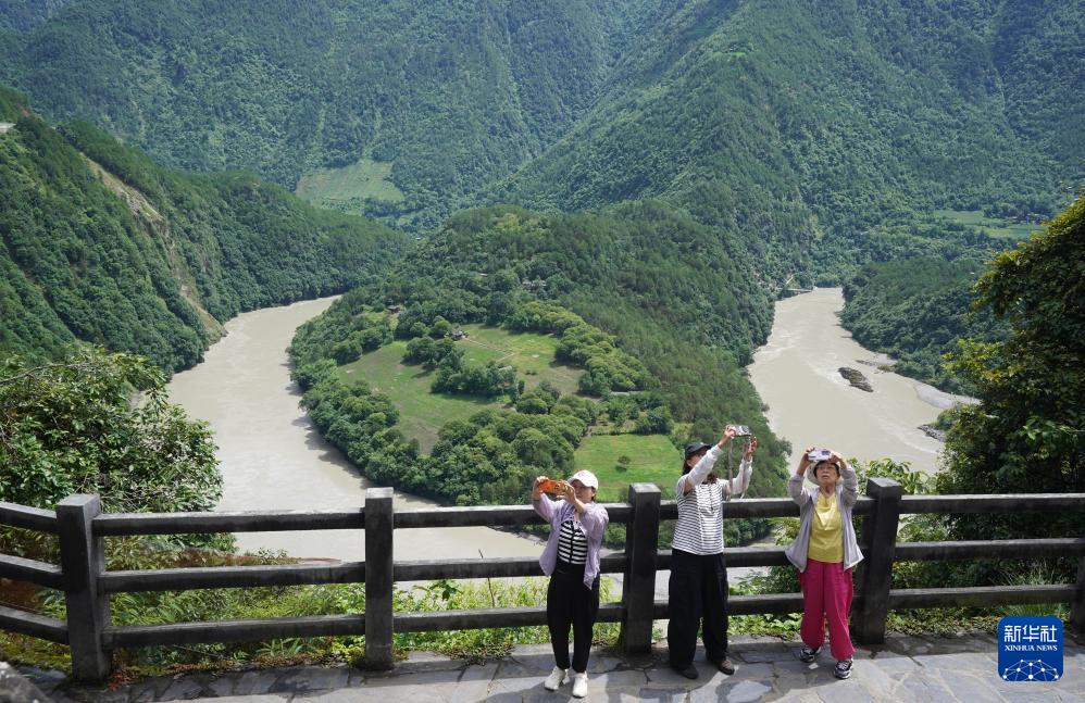 7月15日,游客在云南省怒江傈僳族自治州貢山獨龍族怒族自治縣怒江第一灣拍照游玩。新華社發(梁志強攝)