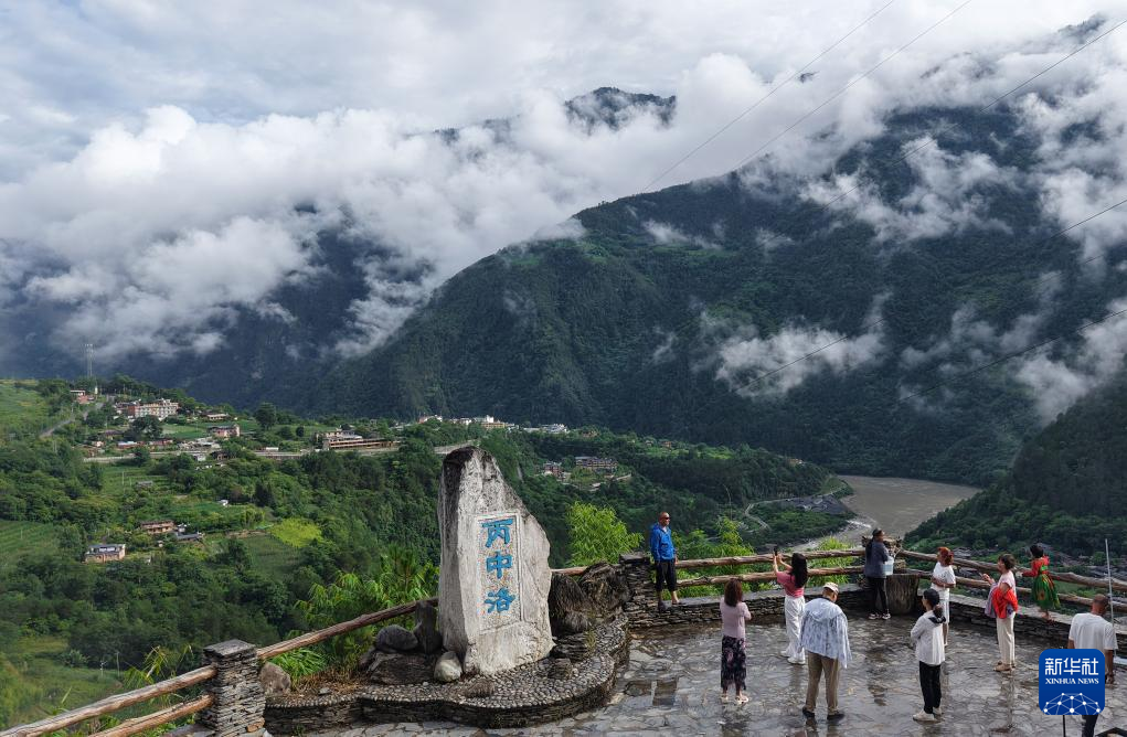 7月15日,游客在云南省怒江傈僳族自治州貢山獨龍族怒族自治縣丙中洛拍照游玩(無人機照片)。新華社發(梁志強攝)