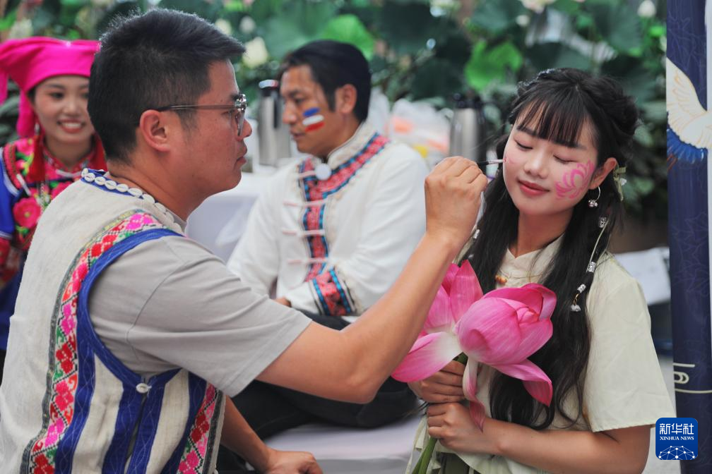 7月14日,在昆明南站候車大廳舉行的“花臉節”活動中,工作人員為游客畫花臉。新華社發(楊紫軒攝)