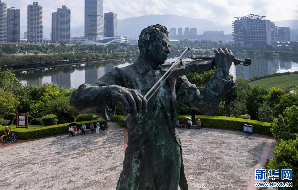 這是7月17日在云南玉溪聶耳音樂廣場航拍的聶耳雕像。(新華社記者 陳欣波 攝)