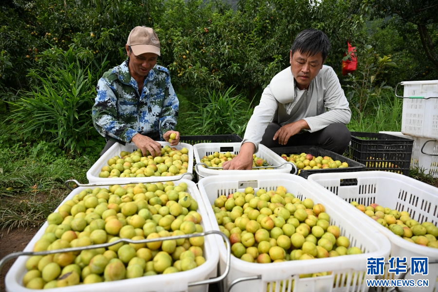 村民整理采摘好的李子(7月27日攝)。新華網發(熊平祥 攝)