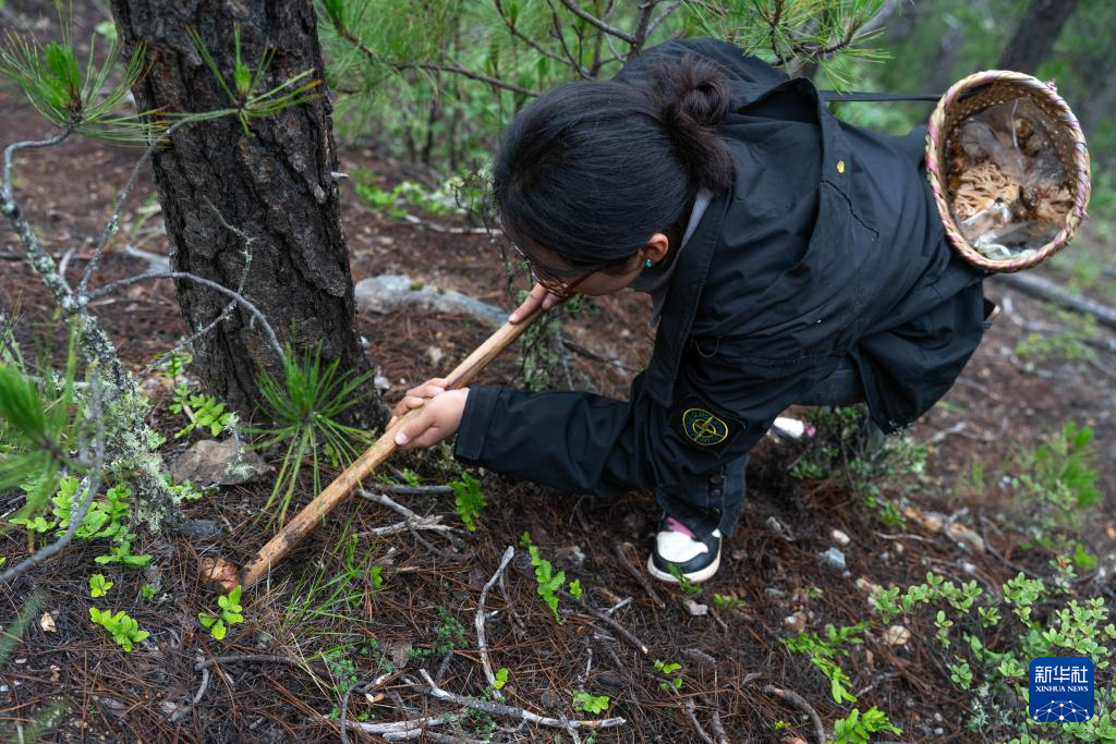7月25日清晨,香格里拉市吉迪村村民拉姆央宗在采松茸。新華社記者 高詠薇 攝