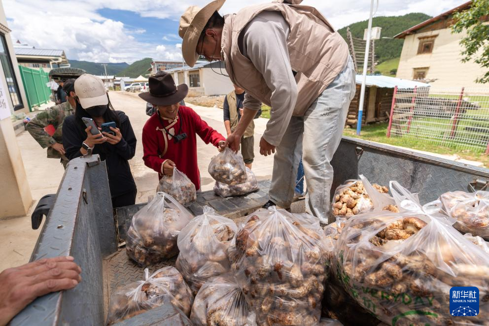 7月25日,春批(中)和村民在香格里拉市吉迪村松茸交易市場外將收來的松茸裝車。新華社記者 高詠薇 攝