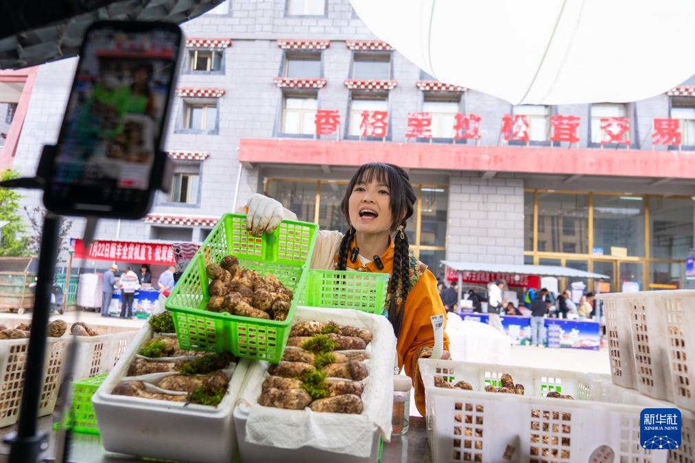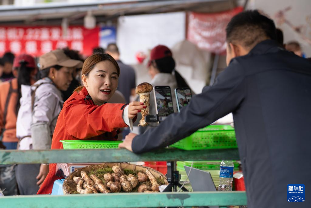 7月24日,主播在香格里拉市松茸交易市場“洛槡”品牌攤位直播推介吉迪村的松茸。新華社記者 高詠薇 攝