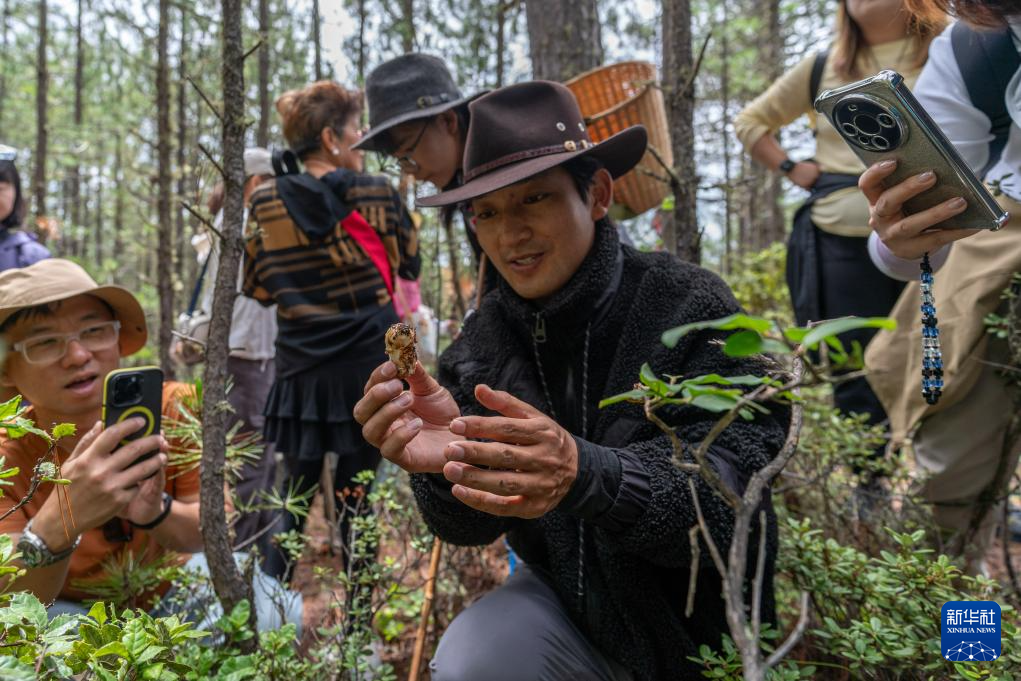 7月25日,春批(中)在香格里拉市吉迪村向游客展示松茸采摘過程。新華社記者 高詠薇 攝
