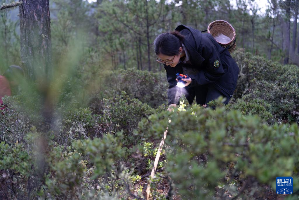 7月25日清晨,香格里拉市吉迪村村民拉姆央宗在尋找松茸。新華社記者 高詠薇 攝