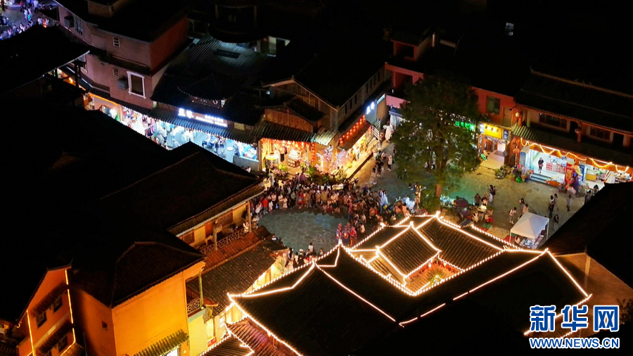 普者黑旅游景區仙人洞村夜間經濟航拍(8月3日攝)。新華網發(朱智 攝)