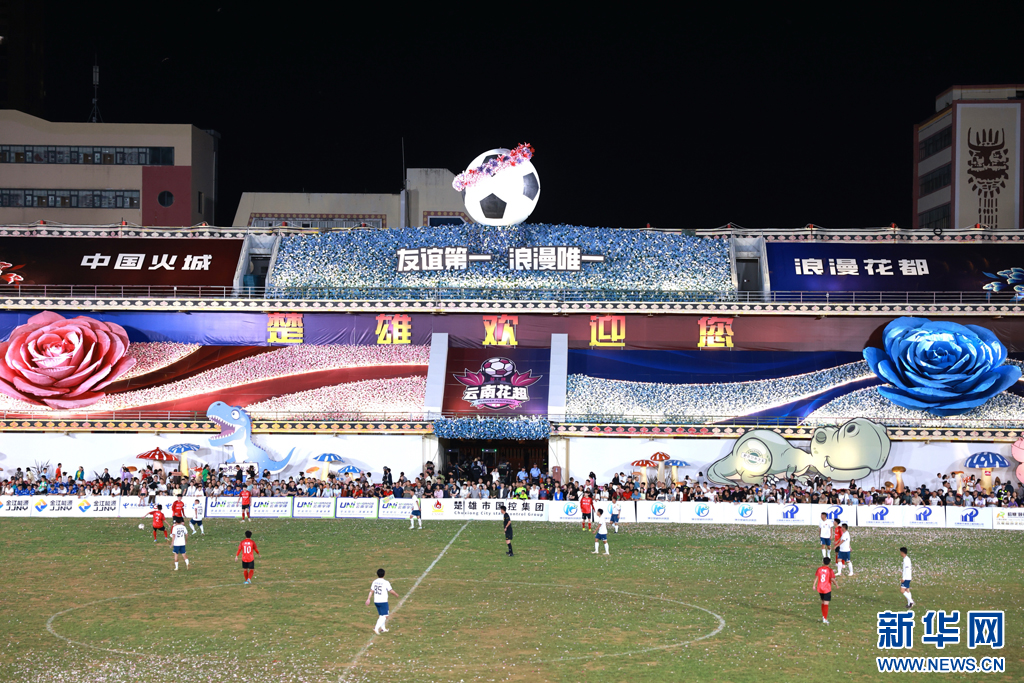 7月12日,2025村超全國賽暨云南鮮花足球超級聯賽在楚雄州體育場激情開賽,體育場裝扮了馬纓花,助威聲伴隨著蘆笙舞,這個以花卉為主題的足球聯賽,向世界展示了云南多民族融合的底蘊和現代體育賽事的發展。