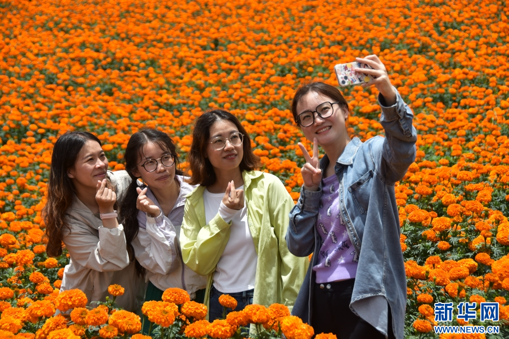 8月10日,游客在云南省紅河哈尼族彝族自治州蒙自市冷泉鎮興隆村的萬壽菊種植基地“打卡”拍照。新華網發 (薛瑩瑩 攝)