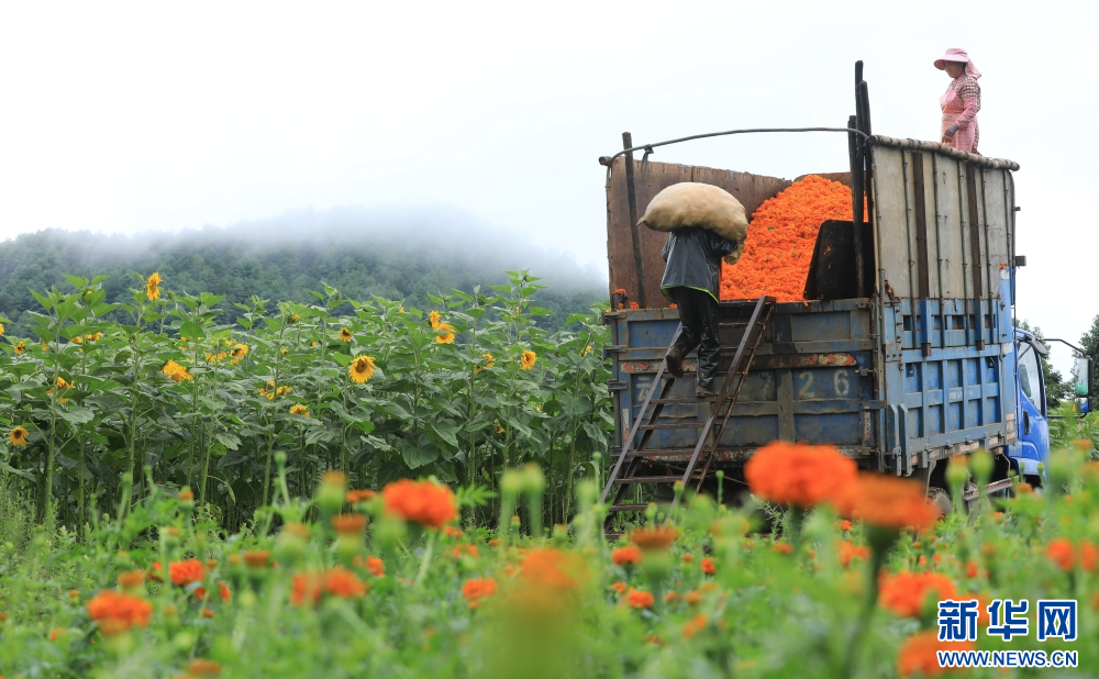 8月6日,在云南省騰沖市明光鎮鳳凰山,花農將采摘的萬壽菊裝車。新華網發(龔祖金 攝)