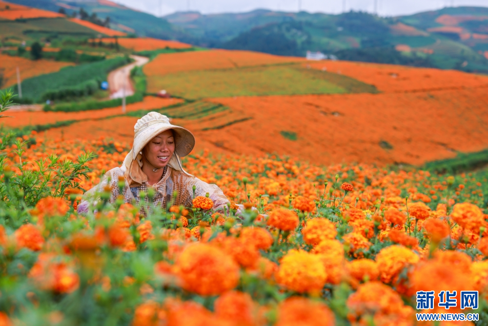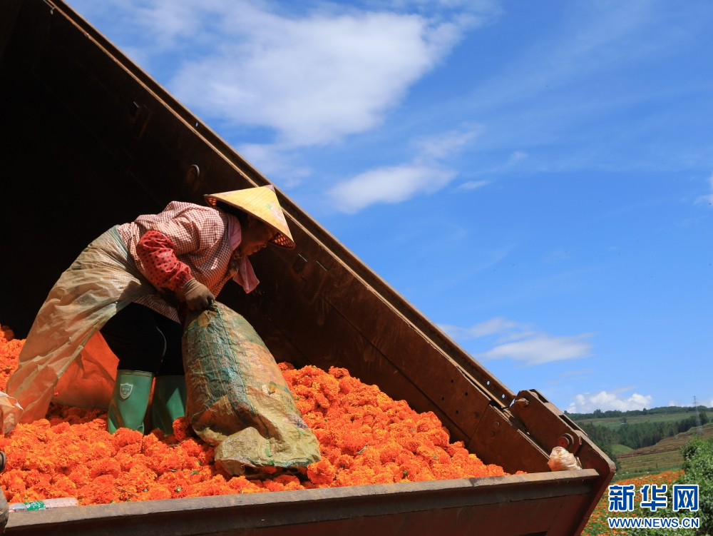 8月5日,在云南省曲靖市陸良縣活水鄉雨麥紅村,花農正忙著采收萬壽菊。新華網發 (王勇 攝)