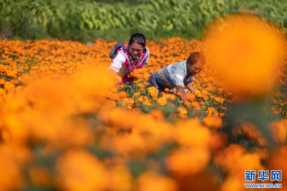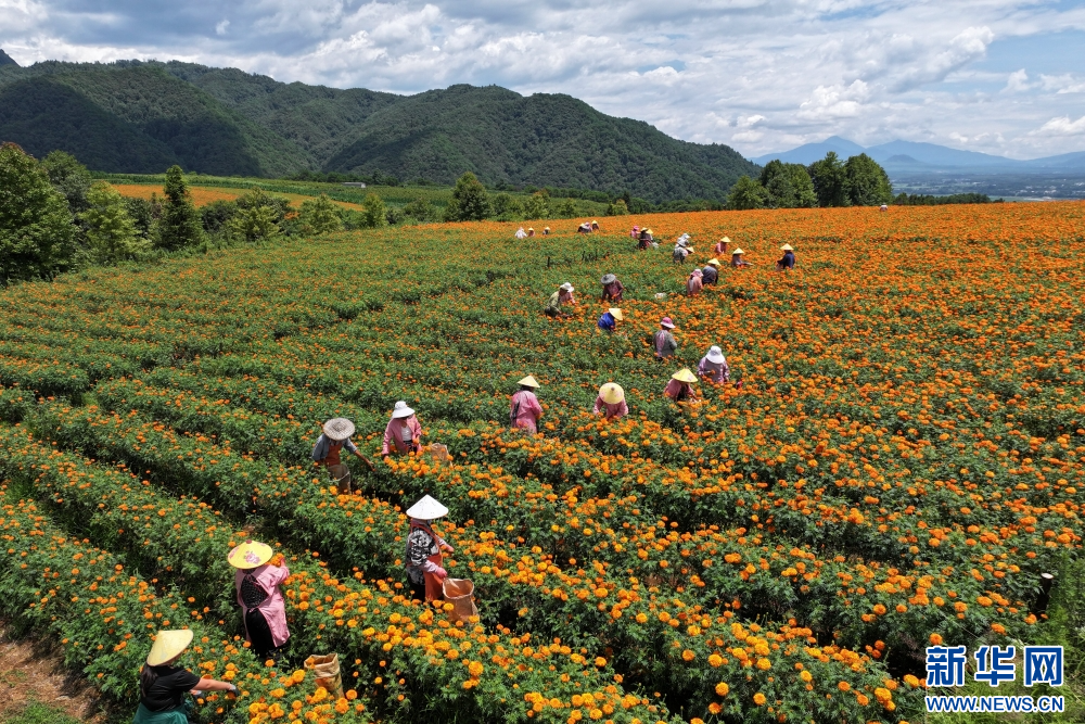 8月7日,云南省文山壯族苗族自治州丘北縣膩腳彝族鄉膩腳村的花農在采收萬壽菊。新華網發(熊平祥 攝)