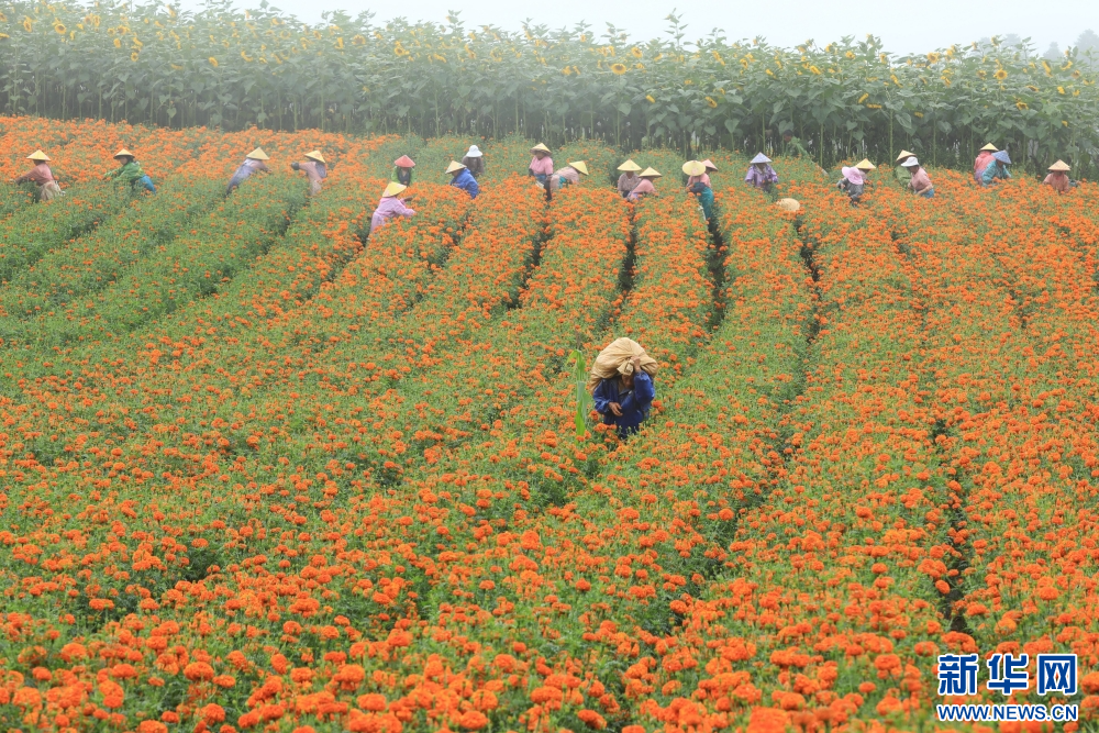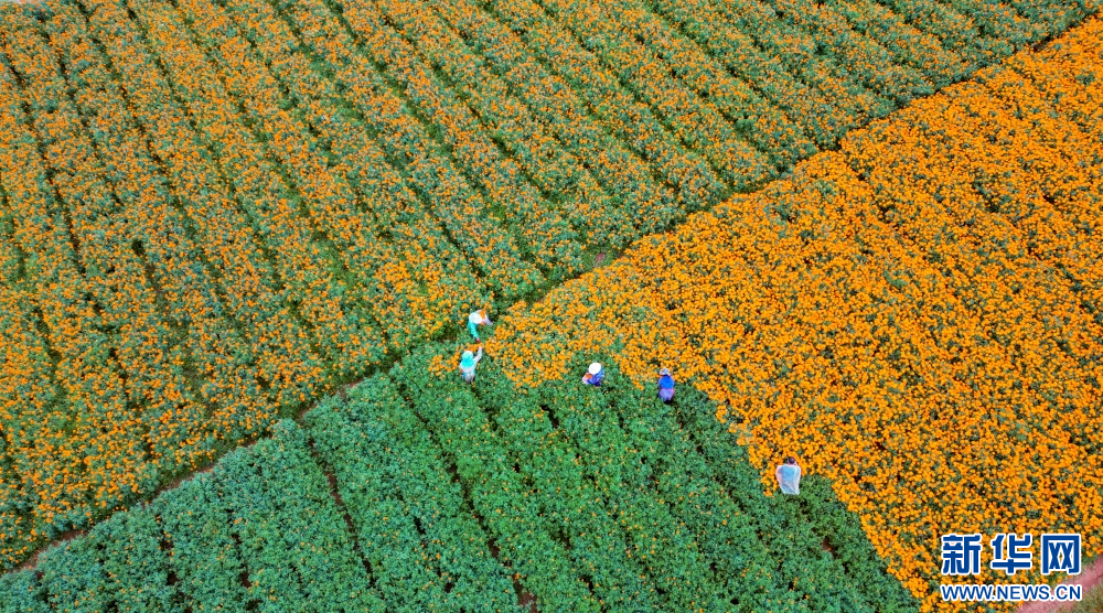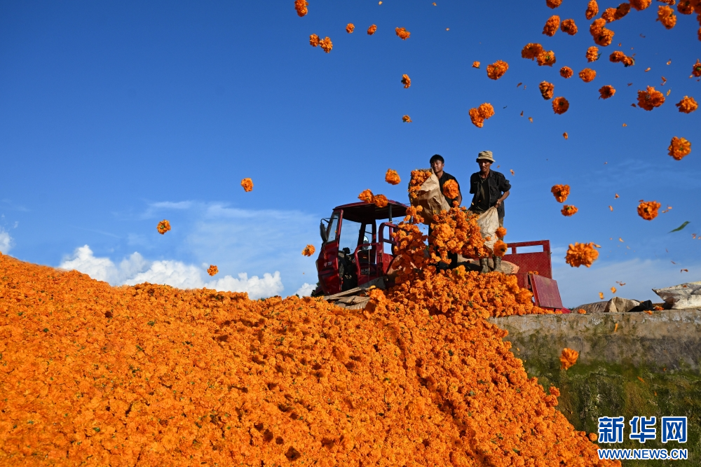 連日來,在云南省蒙自市、開遠市、騰沖市、陸良縣、丘北縣等地,漫山遍野的萬壽菊隨風搖曳,宛如一片金色的海洋?;ㄞr們忙著采摘、裝車、運輸,一派繁忙景象。萬壽菊不僅拓寬農民增收渠道,也為各地豐富旅游業態增色添景,吸引游客走進鄉村“打卡”美景,助力鄉村振興。