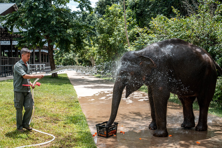 在云南省西雙版納亞洲象救護與繁育中心,“象爸爸”王波給“羊妞”沖涼(8月10日攝)。