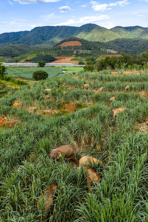 “然然家族”野象在云南省西雙版納州景洪市大渡崗鄉覓食。遠處,一列動車從中老鐵路上駛過(8月10日攝)。